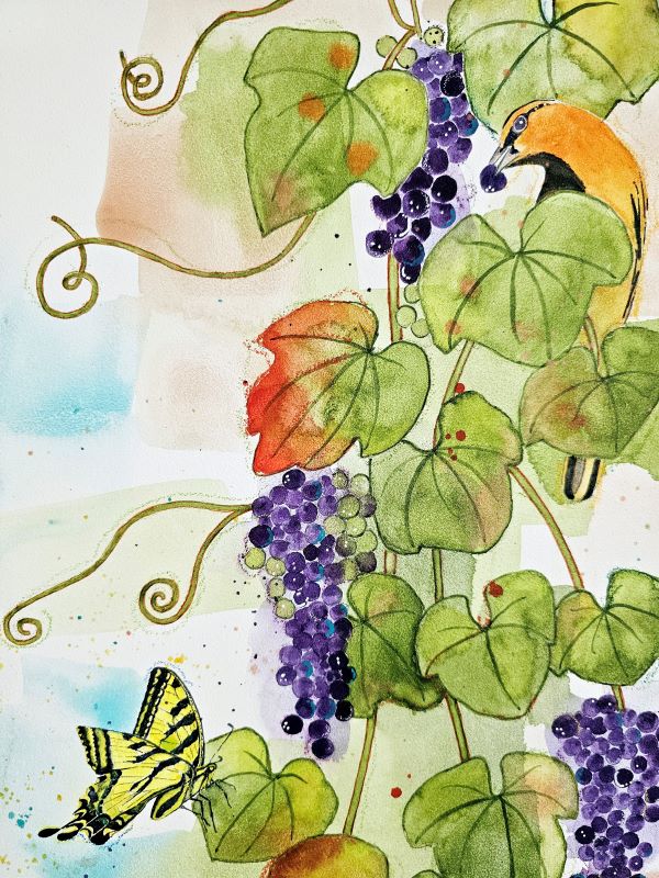 This piece is inspired by my work as a restoration ecologist along the Sacramento and American Rivers. Western tiger swallowtail butterflies quietly float above the vines of California wild grape while a Bullock's oriole tucked among the leaves snatches a ripened grape.