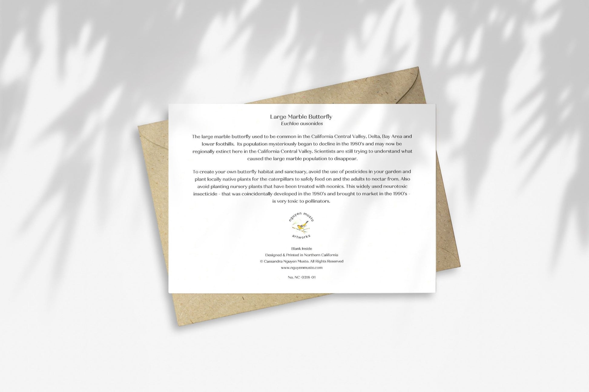Introducing the beautiful Large Marble butterfly notecard, a tribute to California's once-numerous but now rare native species. The delicate creamy white butterfly is exquisitely depicted in a bright watercolor painting, showcasing its fragile beauty.