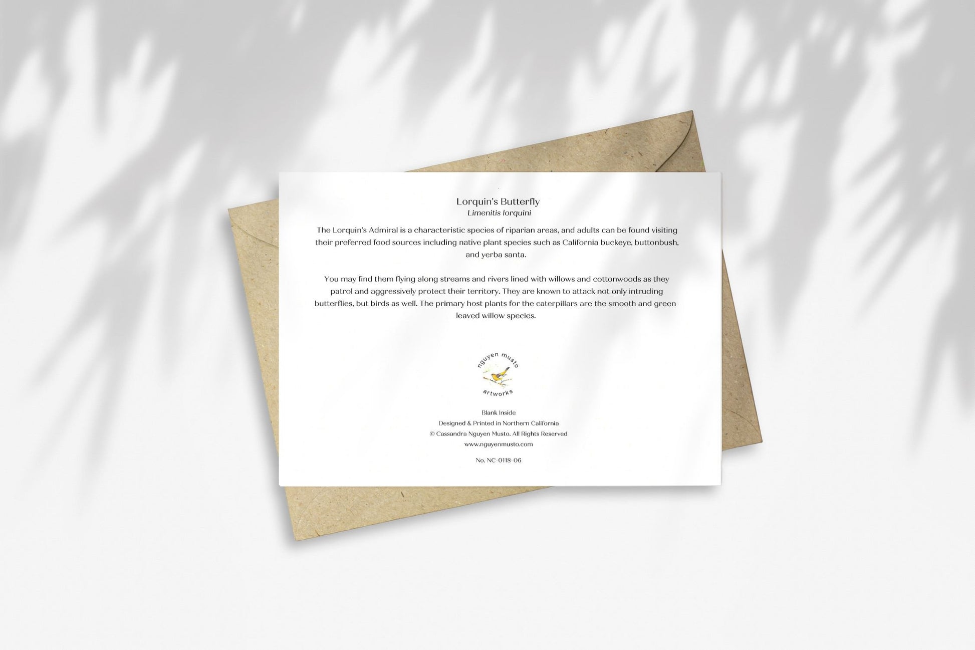 This greeting card features a reproduction of my original watercolor painting of the Lorquin’s Butterfly, a once widespread butterfly in California.