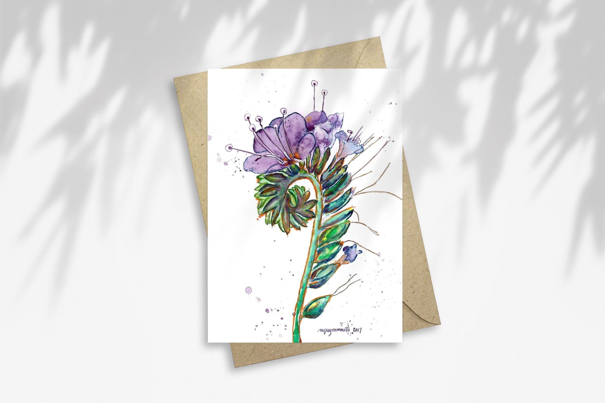 This greeting card features a reproduction of my original watercolor painting of wild heliotrope (Phacelia sp.) during the 2017 superbloom in Anza-Borrego Desert State Park.