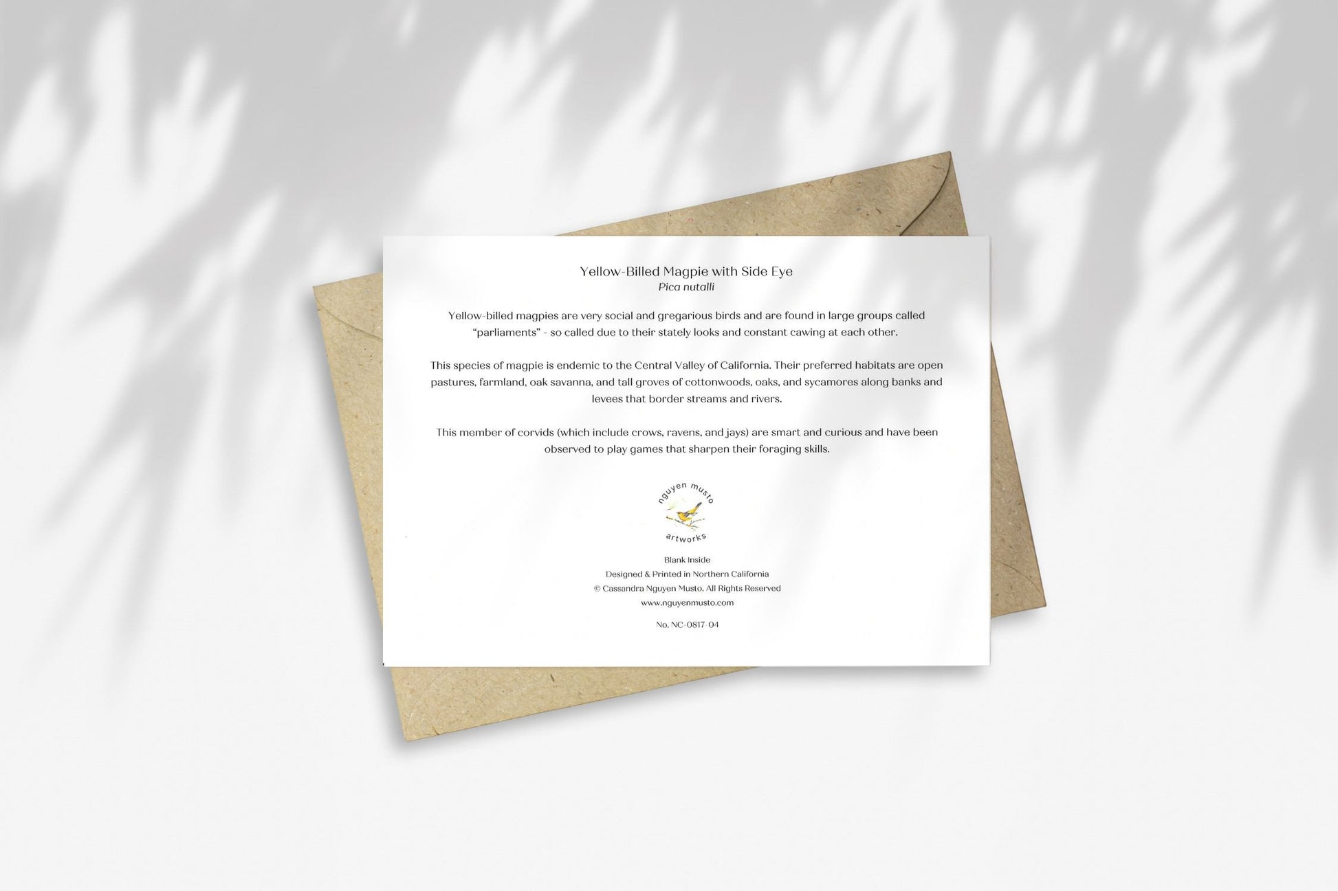 The back of the card includes a description of the bird, adding educational value to your purchase. Our notecard is accompanied by a recycled paper Kraft envelope, making it an eco-conscious choice.
