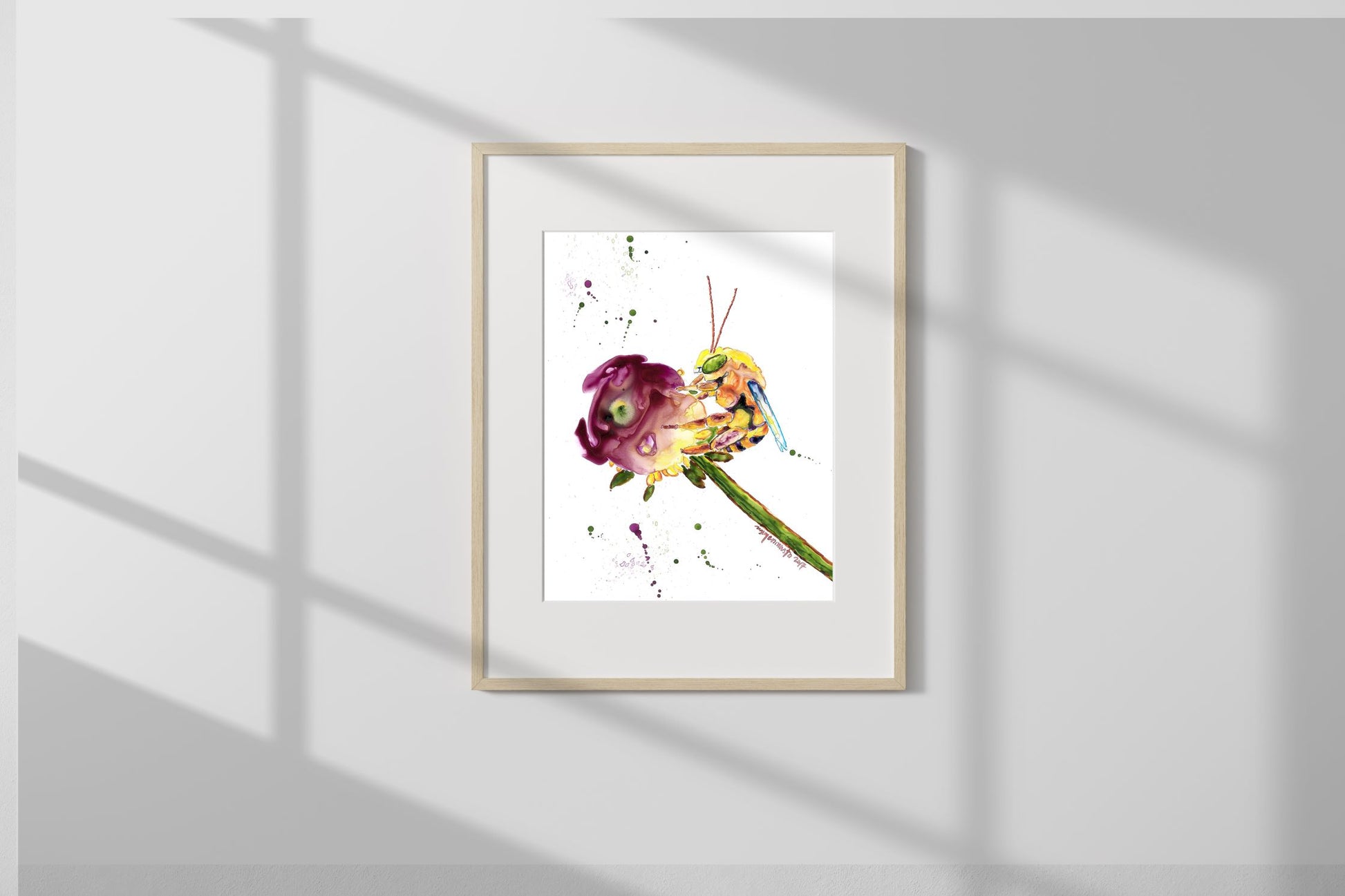 The original art of this long-horned sunflower bee sleeping on a sneezeweed bloom is transparent watercolor painted on Yupo Medium.